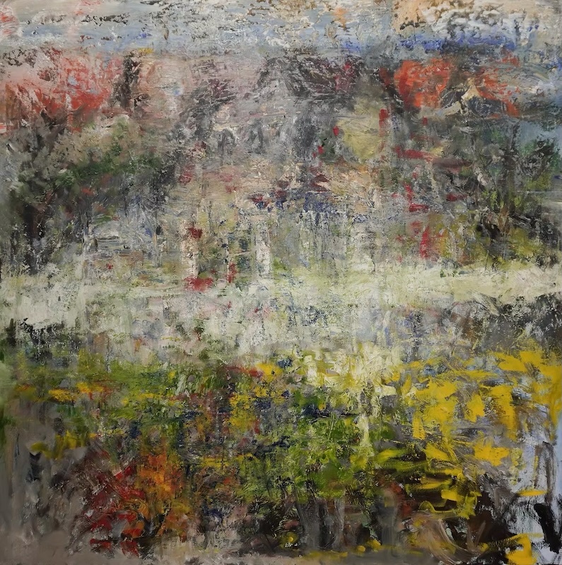 Everything Wet (2021) is another example of everything starting with the sky. In this case, the spiral of rain clouds that appear to have drawn everything into their path. The ground looks sodden, weighed down by the deluge. There is something very tactile and inviting about Radu’s painting. His work is very textural. The paint glides onto his canvases in thick, glistening strokes and he pushes it around, creating layers and then scraping back and working again into the new skin of the surface. This multi-layered approach is very engaging as it lends a certain animation to Radu’s work, a liveliness that suggests the works are in flux, even in conversation with, the elements and landscapes that the artist captures.